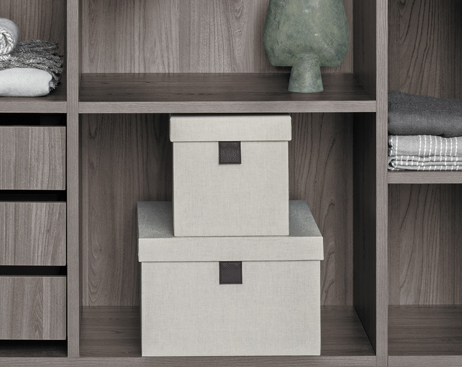 Fabric‑covered boxes and trays, available in various dimensions and finishes, help maintain order and visual harmony, turning each element into a coordinated furnishing accessory.