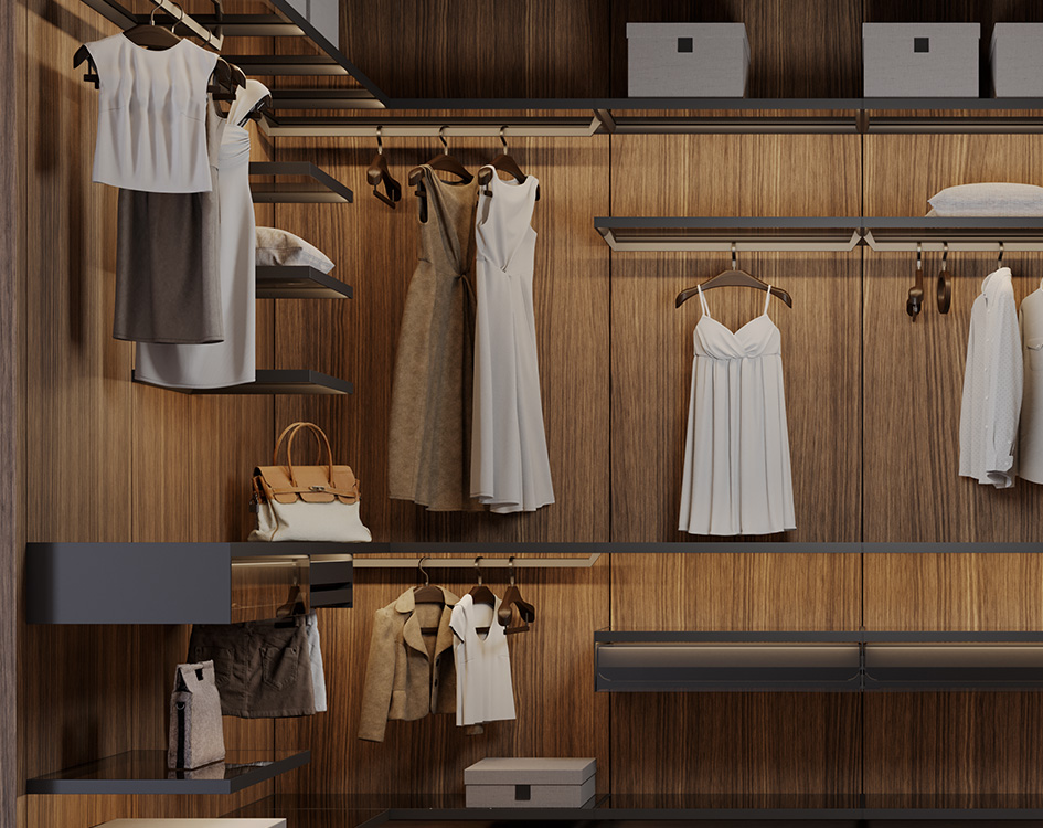 Luxer is an innovative frameless wardrobe system, offering versatile and contemporary storage solutions. Its modular design, featuring shelves, drawers, and various accessories allows for the walls to be cladded for elegant space optimisation meeting any design requirement. Element configurations can be changed at any time, making the environment dynamic and always fully functional.