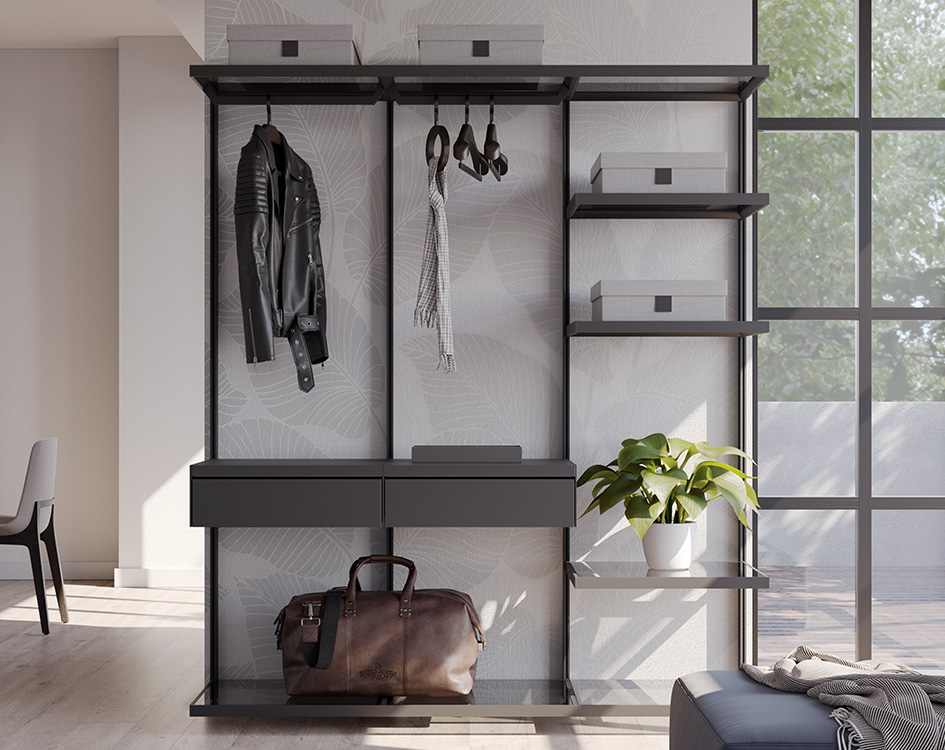 The system is completed by the Excessories collection, a range of refined furniture accessories that bring exclusive wardrobes, designer bookcases, and many other personalized furnishings to life. Aluminium shelves are available, pre wired for lighting and equipped with hanging rail tubes, along with a wide range of drawers in different heights, with fronts in wood, glass, or four sided aluminium. The setup is completed with inclined shoe shelves, hooks, trays, containers, and other coordinated accessories. Each element is designed for maximum flexibility and allows a layout always consistent with the style and needs of the environment.