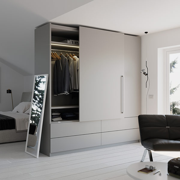 Sliding systems for wardrobes with overlapping doors, coplanar systems and pocket doors, delivering an extremely fluid and silent movement. The systems are ideal for small units used in the kitchen and bathroom or for larger furniture intended for the living room, bedroom and offices.