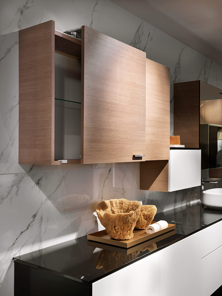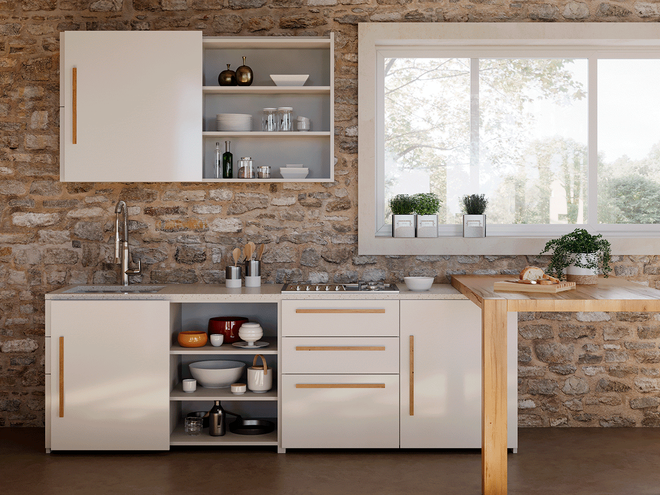Lunch è un sistema d’arredo che permette l’estrazione di un tavolo a penisola da un cassetto standard della cucina. Basta aprire il frontale del cassetto incernierato per sedersi a tavola, dando più funzionalità anche agli spazi limitati. Soluzione pratica e resistente che diventa protagonista in cucine di piccole dimensioni e angoli cottura che richiedono una base d’appoggio per la prima colazione o semplicemente un ampliamento del piano di lavoro per la preparazione di un pranzo, poiché si ottiene un tavolo da 900mm circa in massima apertura.