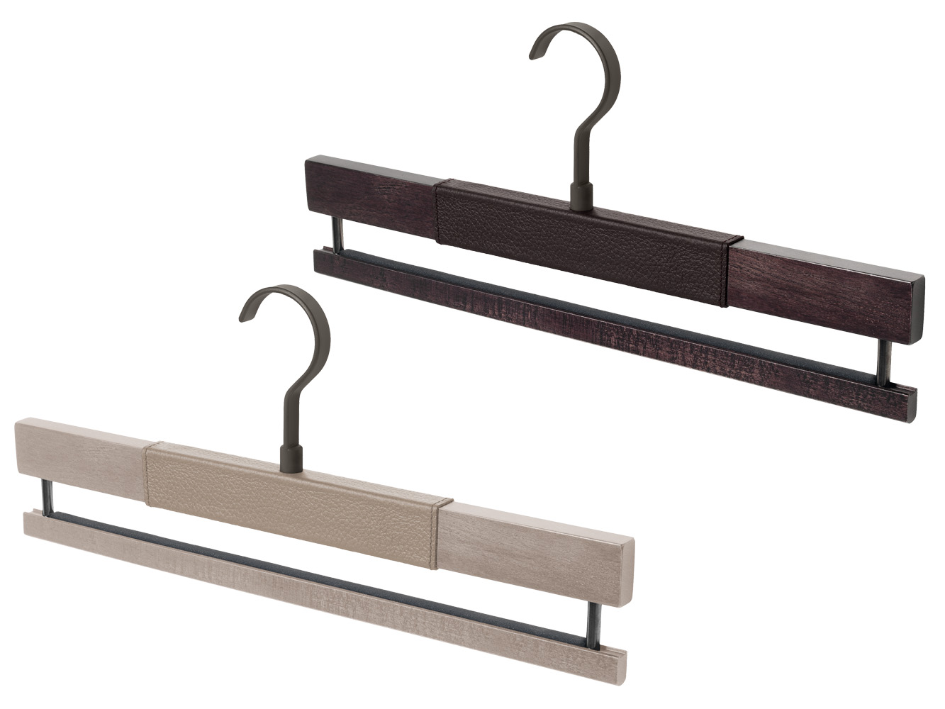 Cintres, porte-vêtements et porte-sacs en hêtre peuvent être personnalisés grâce à des inserts en cuir. Les éléments techniques, comme les tiges et les supports extractibles ou pivotants, se distinguent également par un design épuré et des matériaux raffinés, alliant praticité et harmonie esthétique. Chaque détail est conçu pour allier élégance et fonctionnalité, au service de votre quotidien.