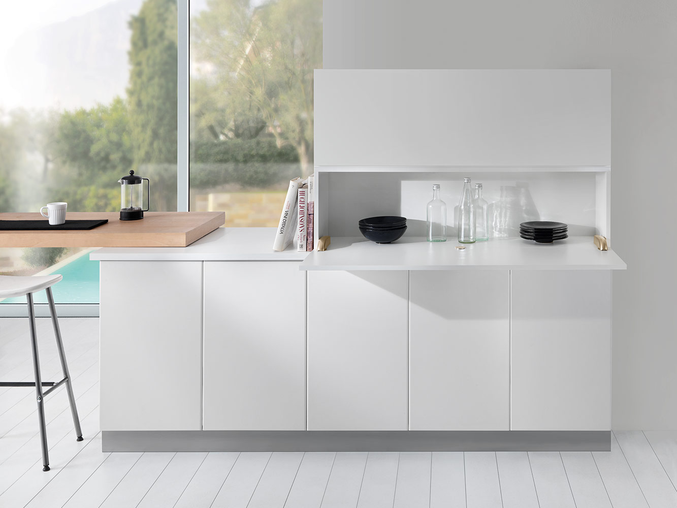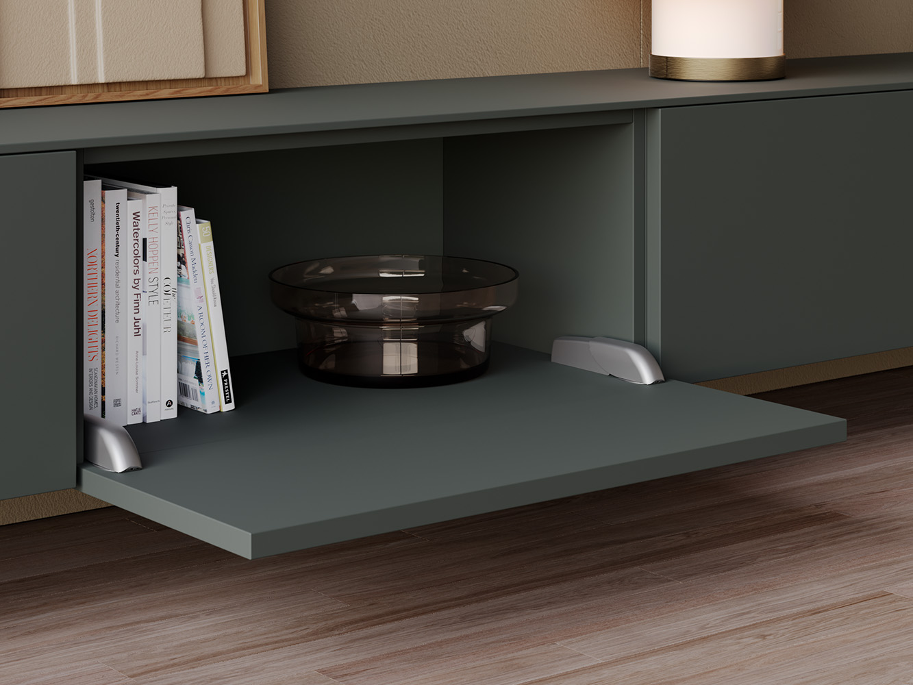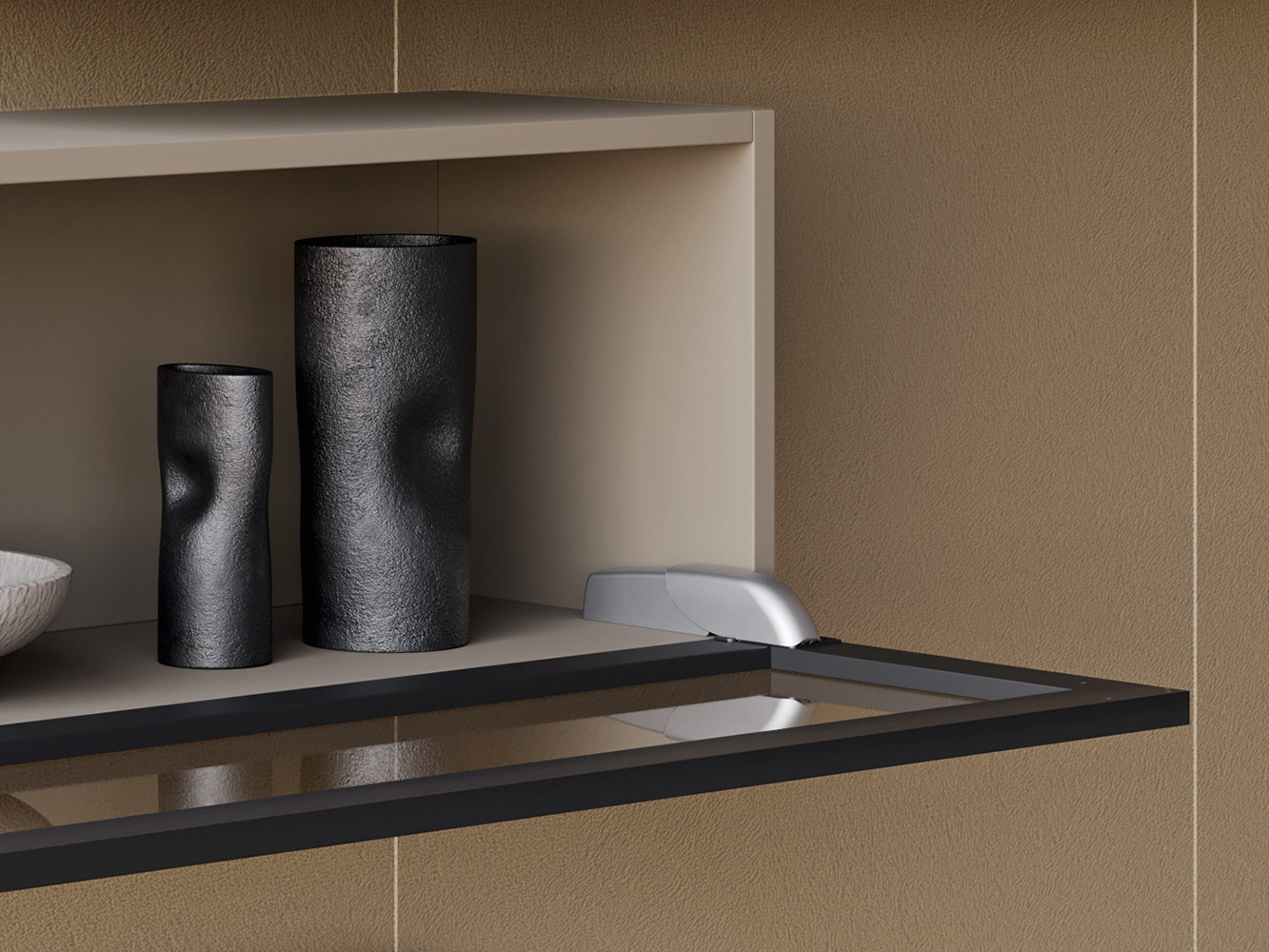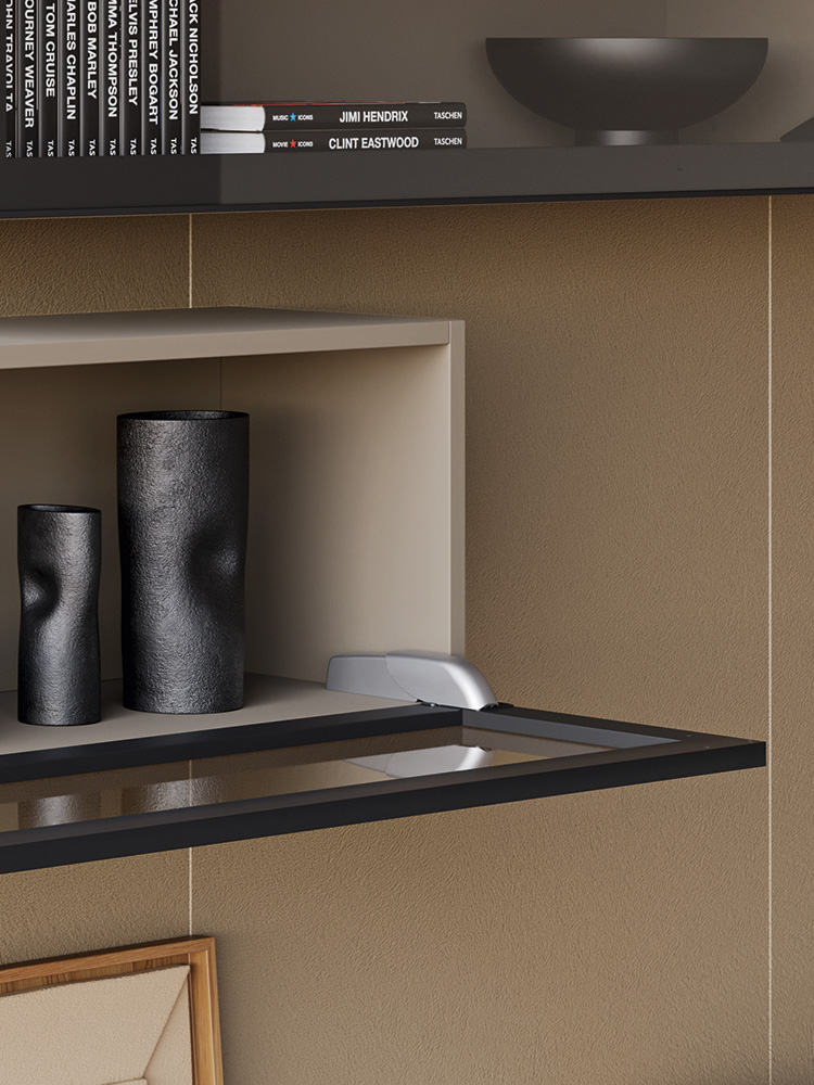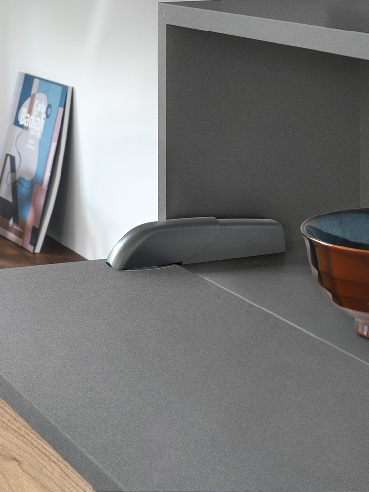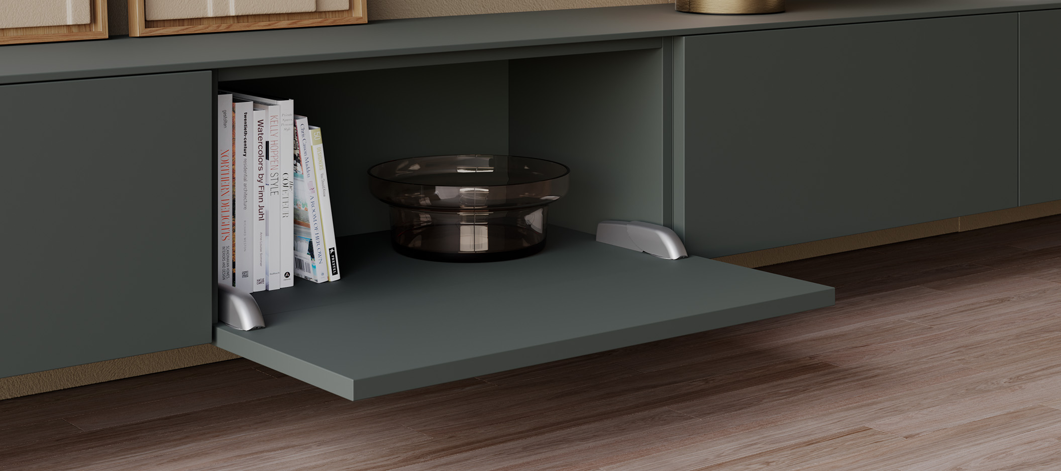 Durante l’apertura, l’anta si muove con un’azione morbida e controllata grazie alla decelerazione integrata, fino a formare un piano perfettamente allineato con la base del mobile.
