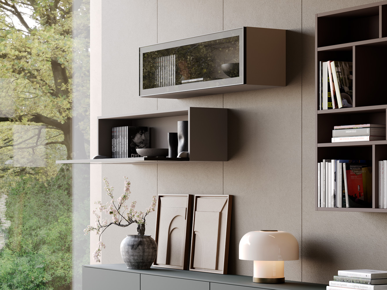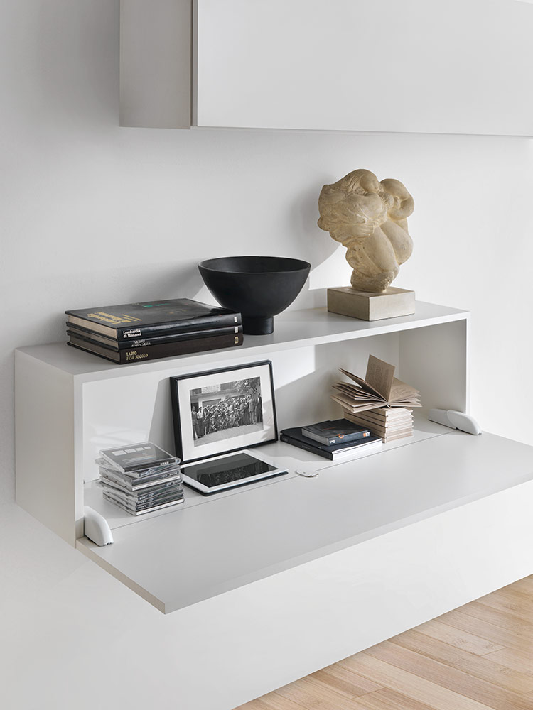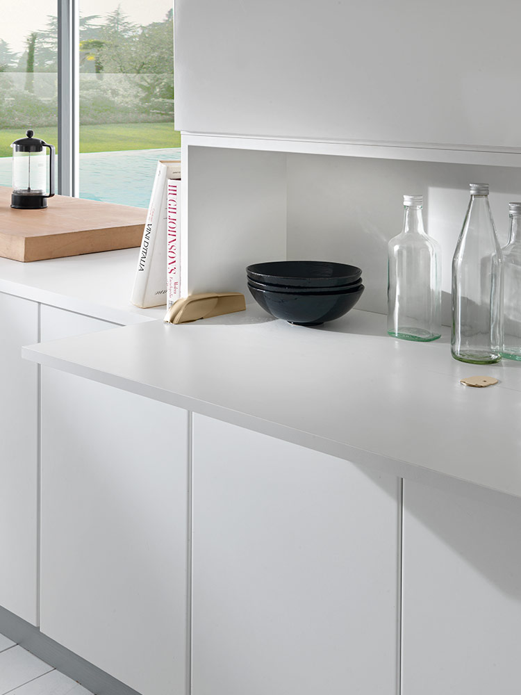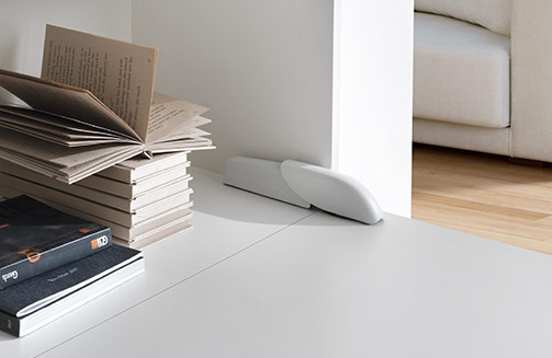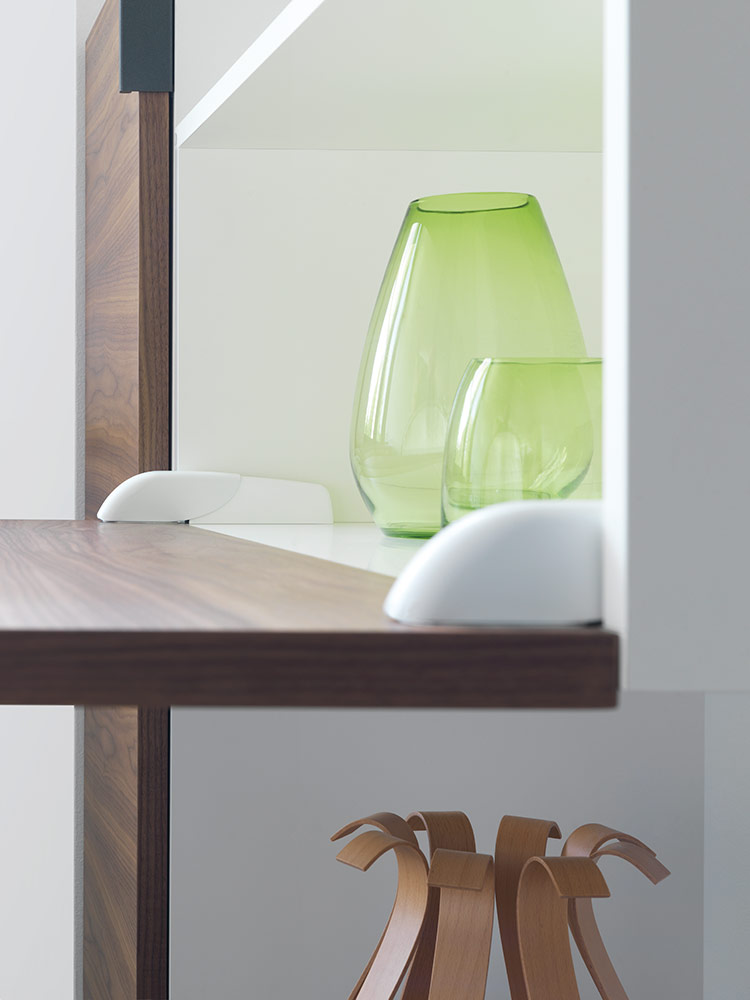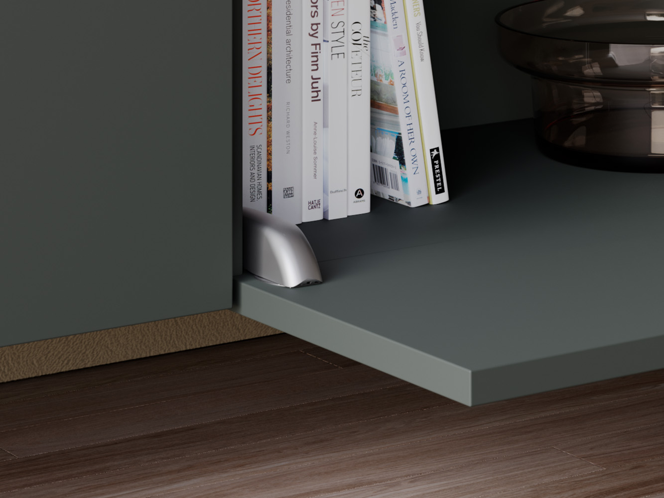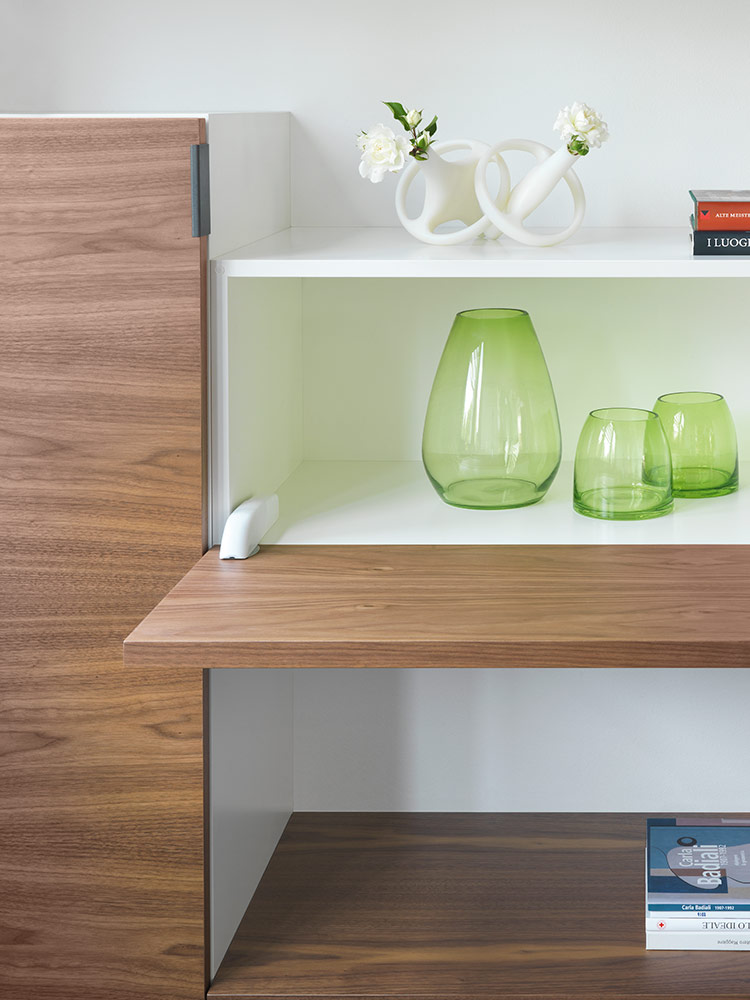 Durante l’apertura, l’anta si muove con un’azione morbida e controllata grazie alla decelerazione integrata, fino a formare un piano perfettamente allineato con la base del mobile.