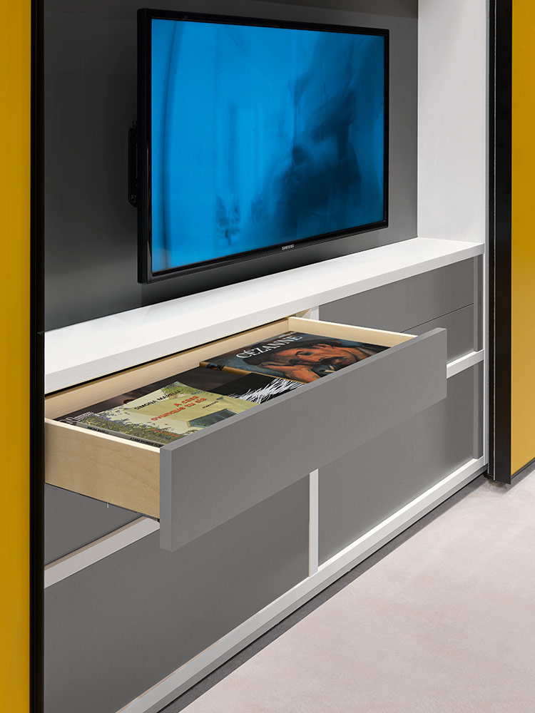 É disponível em três versões: com fechamento tradicional “Self-closing”, com abertura “Push” em móveis sem puxadores e com fechamento amortizado “Smove”.